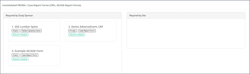 In the first field “Unscheduled PROMs / Case Report Forms (CRFs, AE/SAE Report Forms)” questionnaires can be added (by drag and drop), which should be available for completion at any time during the study, e.g. questionnaires on Adverse Events (AEs).