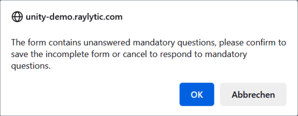 A warning message at the end of the questionnaire will be displayed to inform about missing answers. If this was intended by the transcriber, “OK” can be selected (Figure 4).