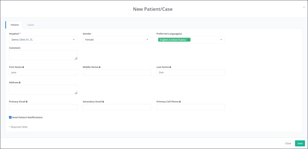 Entering patient´s personal data (“Name”, “Gender” or “Address”) should be done according to local guidelines. All fields with the padlock symbol are encrypted and can only be seen by site users of the site to which the patient belongs.