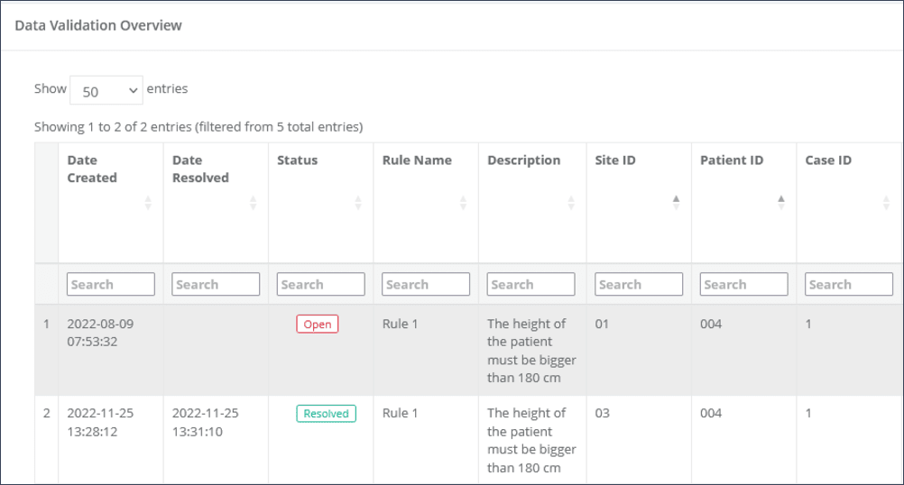 The “Data Validation Overview” is presented in form of a table. Each validation rule breach for each patient is presented in a single row with additional information of “Date created”, “Date Resolved” (if applicable) and a “Status” of the rule breach (Figure 2).