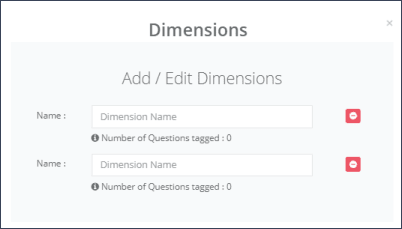 “Dimensions”: If a Questionnaire needs to be divided in “Dimensions” (e.g., for specific scoring methods) the dimension(s) need to be created first. Click on “Dimensions” and enter a name for each dimension. Multiple dimensions can be created at once. Click on “Add Dimension” to add additional dimensions. To remove a dimension, click on the red minus sign next to the dimension (Figure 2).