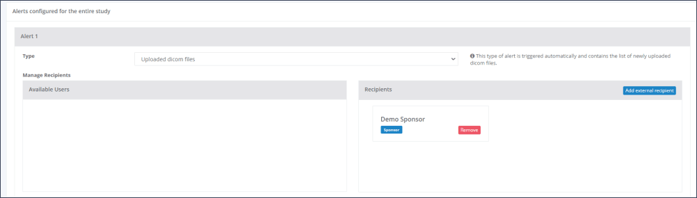 Step 5: Choose who shall receive this alert. You can either select from RAYLYTIC Platform users which have access to the study and add them to the Recipients via drag & drop or you can add an external recipient by clicking on the blue button “Add external recipient” and enter the email address to which this alert will be send (Figure 3).