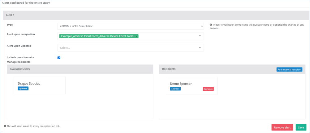 Step 5: Choose who shall receive this alert. You can either select from RAYLYTIC Platform users which have access to the study/site and add them to the “Recipients” via drag and drop or you can add an external recipient by clikcing on the blue button “Add external recipient” and enter the email address to which this alert will be send (Figure 4).