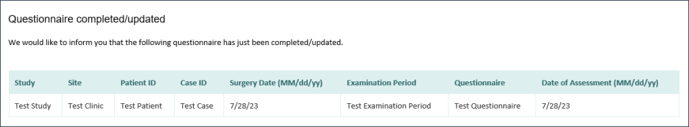 Optional: By checking the “Include questionnaire” box, a pdf file of the completed or updated questionnaire will be attached to the email alert