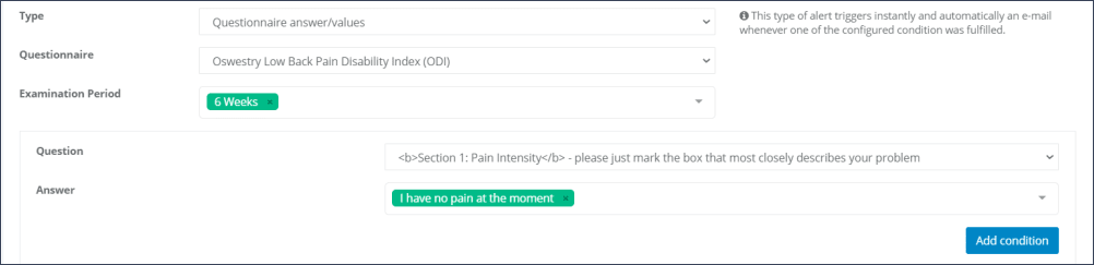 Step 6: Click on the blue button “Add condition”. If you like, you can add further conditions which trigger an alert for this questionnaire’s answers.