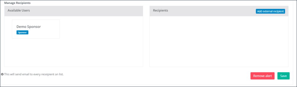 Step 7: Choose who shall receive this alert. You can either select from RAYLYTIC Platform users which have access to the study/site and add them to the"Recipients" via drag and drop or you can add an external recipient by clicking on the blue button “Add external recipient” and enter the email address to which this alert will be send (Figure 4).