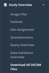 To download images from the overview, you can either click on the download icon (Figure 2) in the individual cell of the table and then select whether the image should be downloaded as a jpg file or in DICOM format, or you can select the subsection “Download All DICOM Files” (Figure 3) under the menu item “Study Overview” to download all image data currently available in the study.