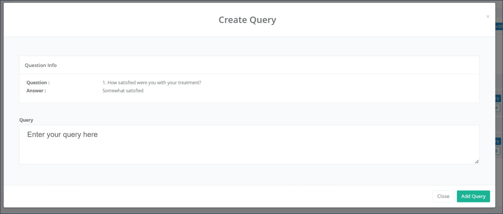 Step 4: In order to get the discrepancy or inconsistency in the data checked by the site, a query text or message has to be entered in the free text field “Query”. By clicking on the green labelled button “Add Query”, the query message will be created and saved in the study database (Figure 4).