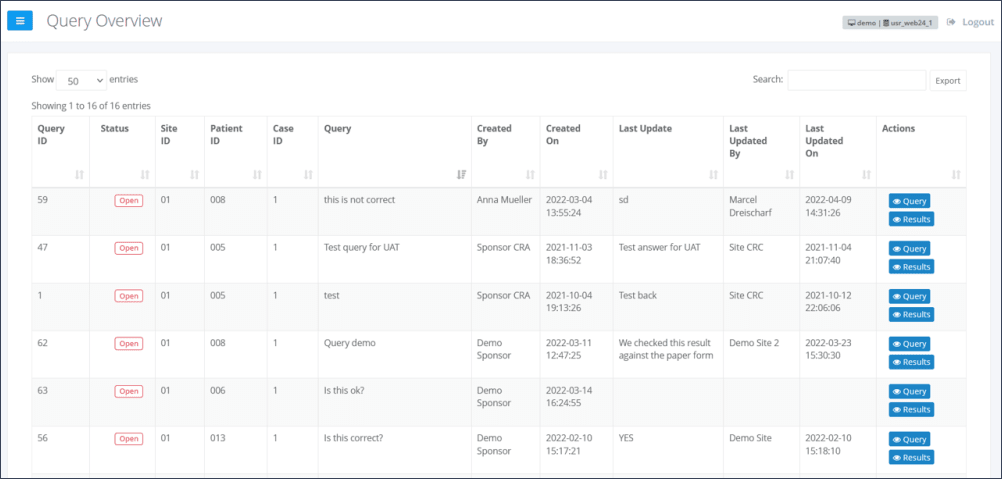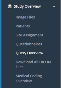 An overview of all queries and their different status within a study can be accessed under the menu section “Study Overview” and subsection “Query Overview” (Figure 9).