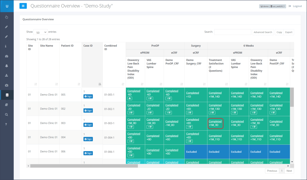 Step 2: By clicking the underlined “Completed” for the corresponding patient and time point, the questionnaire results which need to be verified will be opened (Figure 2).