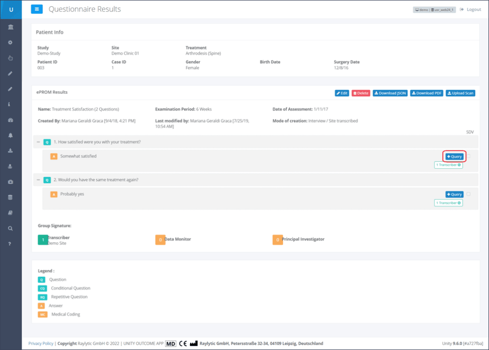 After refreshing the Questionnaire result overview, the resolved or closed query will be displayed as a blue-labelled icon “Query” with an eye symbol and is appearing next to the corresponding question and answer.