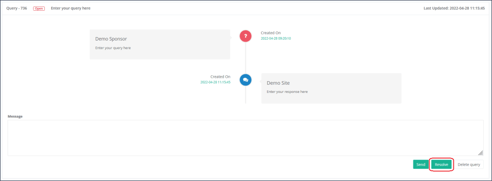 Please note: Only a sponsor user with the additional permission “Resolve Query” is allowed to resolve/delete a query.