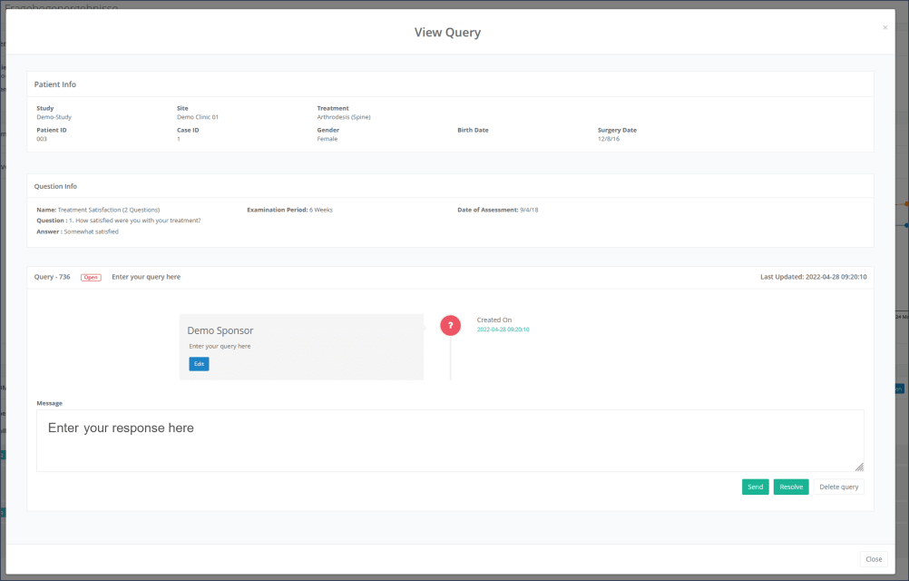 Step 8: If a query was created by error or for testing reasons, a sponsor user is able to delete a specfic query. To do this, you must enter a message in the text field, but instead of clicking the “Resolve” button, you click the white “Delete Query” button (Figure 8). The query in question is then defined as “Closed”.