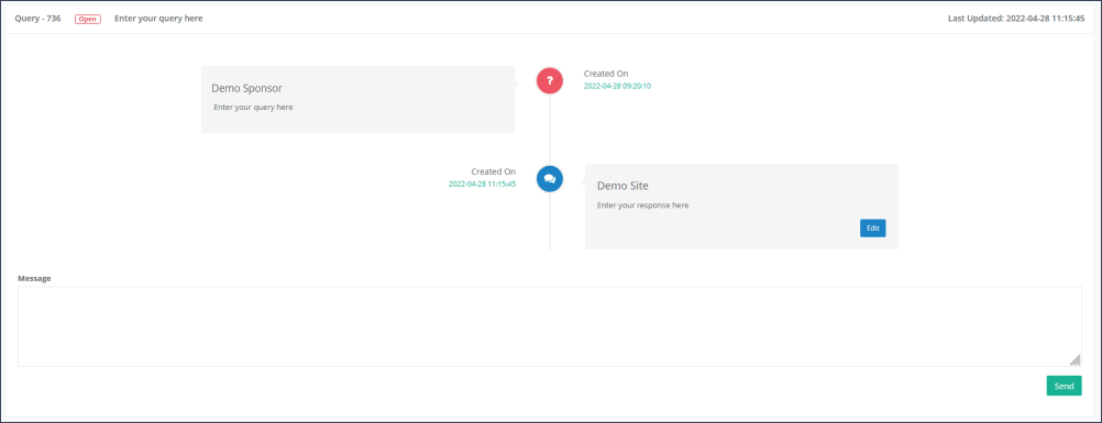 Step 6: For Answering a query, the yellow-colored icon “Query” has to be clicked and the window “View Query” is opened. The response to a query has to be entered in the free text field “Message” and submitted by clicking on the green-colored button “Send” (Figure 6). The saved response to the query will then be displayed in the chat history at the right-hand side at the “View Query” window (Figure 7).