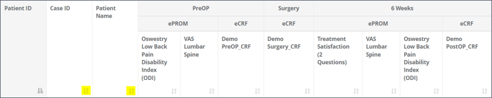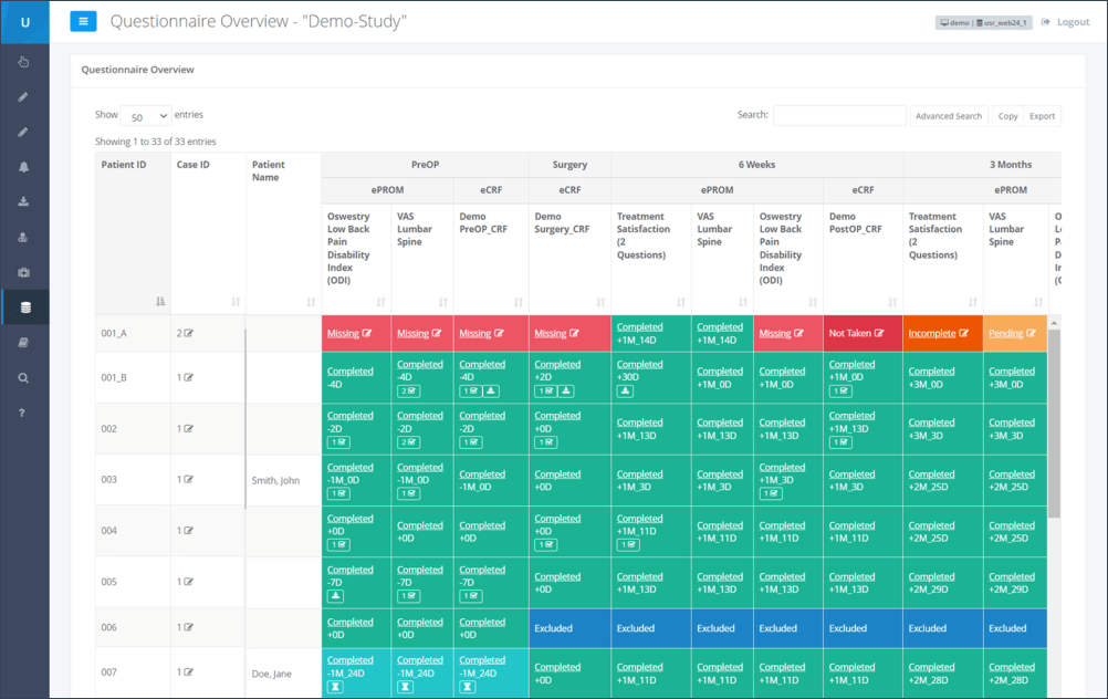 The “Questionnaire Overview” is presented in form of a table. In the header of the table the respective time points of the visits are shown (e.g., 6 weeks) that are required for the selected study. Below, the questionnaires assigned to these points in time, separated for ePROMS and eCRFs, are listed. Each patient is then represented in a single row with each cell representing the status of the questionnaire at the respective study time point (Figure 2).