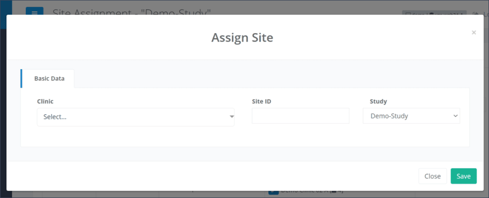 Here, the site can be assigned to one of your studies and give this clinic its “Site ID”. You can either choose from the Dropdown menu “Clinic” or type in your clinic’s name for filtering. The “Study” is predefined, depending on the previously selected study.